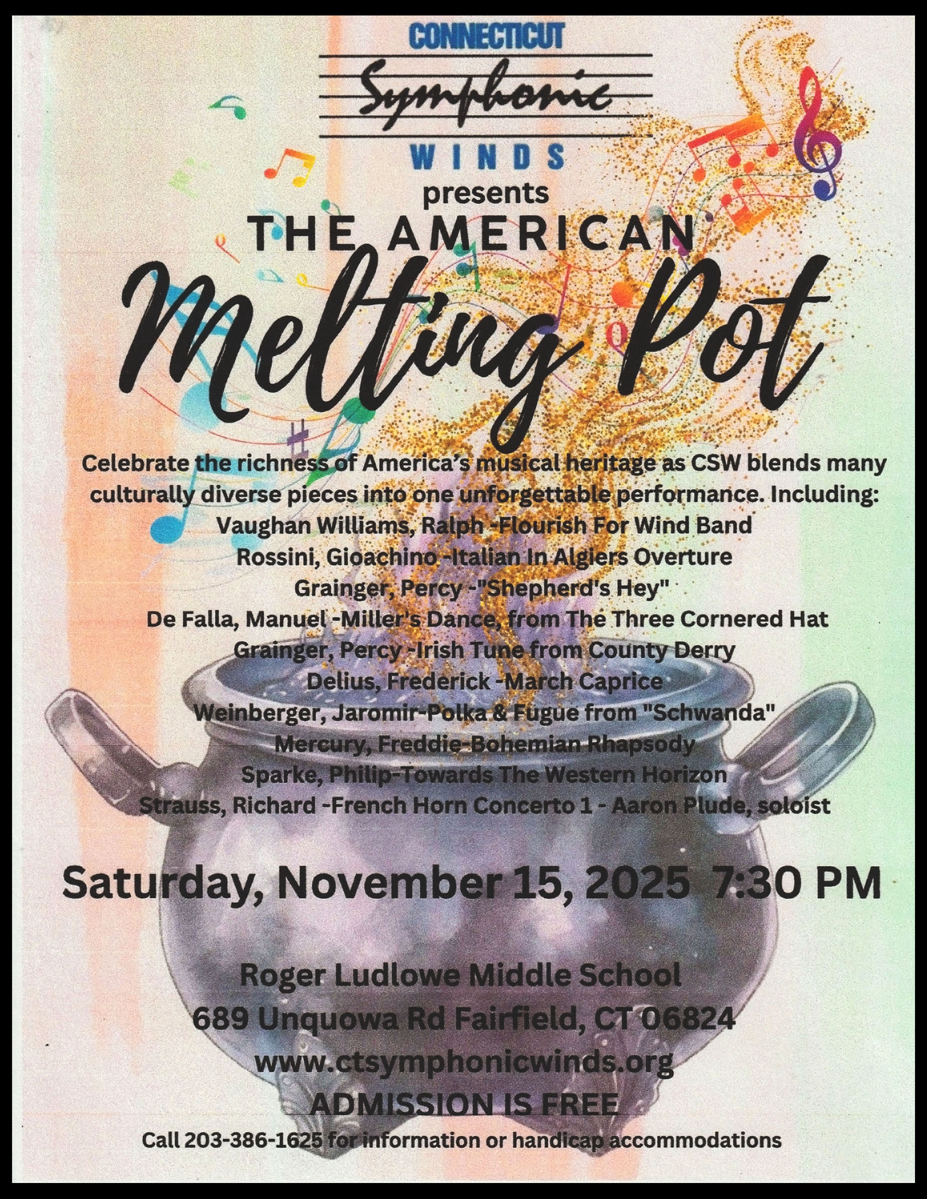On Saturday, November 17 (2018) the Connecticut Symphonic Winds performed in the Roger Ludlowe Middle School Theatre, at 689 Unquowa Road in Fairfield, CT. The concert theme was "Music from the other side of the Atlantic" and included Respighi's Pines of Rome, von Suppe's Beautiful Galatea Overture, Vaughan Williams' English Folk Song Suite, Sibelius' Finlandia, Texidor's Amparito Roca, and Sparke's Hymn to the Highlands Suite. These concerts are free and open to the public. For more information call (203) 386-1625 or email ctsymphonic@yahoo.com. DIRECTIONS & MAP . . . CONCERT FLYER . . .