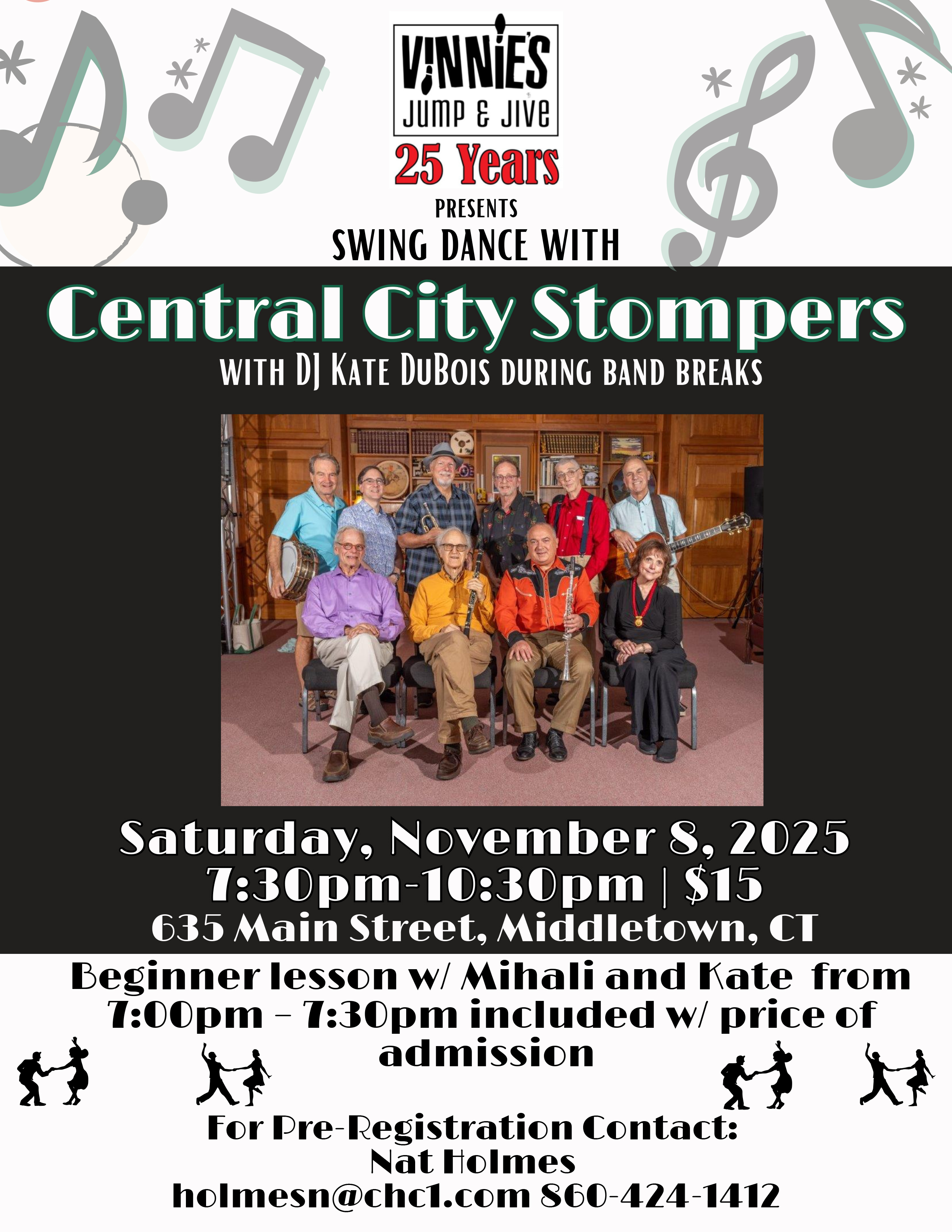 On Friday, November 8 (2025) the Central City Stompers will perform at Vinnie's Jump & Jive , located at 635 Main Street in Middletown. There will be a free Swing lesson from 7:00 to 7:30 pm (with the $15 dance admission) followed by dancing from 7:30 to 10:30 pm.