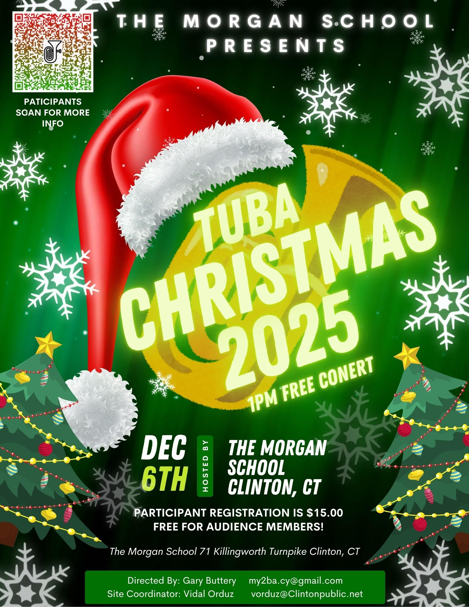 On Saturday, December 3, 2016 Connecticut’s Tuba Christmas was held at Old Saybrook High School, 1111 Boston Post Road in Old Saybrook. The 10AM registration, 10:30AM rehearsal and 1PM concert were in the beautiful, warm, and comfortable School Auditorium. For more information, contact Gary Buttery (860)447-9964 (email: my2ba.cy@gmail.com) POSTER with details: